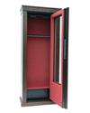 a six gun safe with an oak finish, the interior lined with red baize, toughened glass, interior lighting, measuring approx. 66in. x 27in. x 15in.