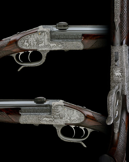 action incorporating Franz Jaeger 1906 patent 'kippblockverschluss' sprung breechblock, manual safety, set triggers, action flat signed 'Scheiring jun.', the whole carved in high relief with bold germanic scrollwork, the left sideplate depicting Diana, Goddess of hunting, with hounds and a stricken red stag her crescent moon highlighted in gold, signed 'G. STOGNER', on the right St. Hubertus, flanked by hunting hounds, crossbow in hand, kneeling in supplication to the Hubertus hirsch, the crucifix highlighted in gold, the underlever finely carved with a monogram, the top tang with a hive, old silver finish, 14 1/2in. highly-figured pistolgrip stock with slight hogsback comb, sculpted cheekpiece, sling swivels, sculpted horn pistolgrip-cap, fishscale chequering and including 1/2in. rubber recoil pad, weight 7lb. 8oz. (5.6x50R) and 8lb. 7oz. (.270 WM), in its fitted lightweight leather case with provision for both barrels and telescopic sights