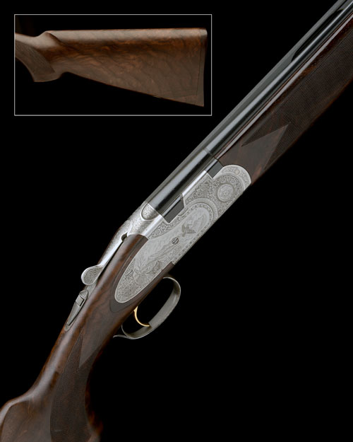28in. nitro barrels with 6mm ventilated matt top-rib, 3in. chambers, multichokes, hold-open toplever, automatic safety with integral barrel selector switch, gold-washed trigger, fully engraved with floral and scroll engraving, with game scenes of pheasant and woodcock, triggerplate signed 'Bottega C. Giovanelli', bright finish overall, 14 3/8in. highly-figured pistolgrip stock including buttplate, weight 6lb. 8oz., in its universal case