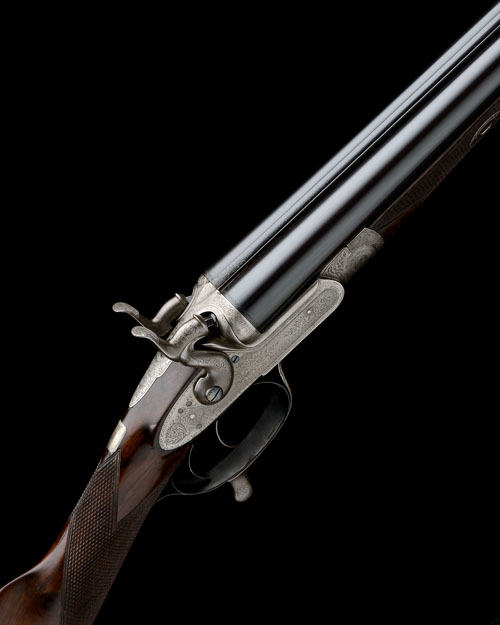 converted from muzzle loader, 27 3/4in. sleeved nitro barrels, rib with later engraving, 2 1/2in. chambers, bored approx. true cyl. and 1/4 choke, rotary underlever, carved percussion fences, non-rebounding locks with dolphin hammers, border and flowing acanthus scroll engraving, the trigger engraved with a hound on point, the triggerguard tang with a nye of pheasants, brushed bright and blued finish, 14 1/4in. figured stock including 1in. extension, with steel buttplate with extended topstrap engraved with a naturalistic scene, weight 6lb. 8oz.