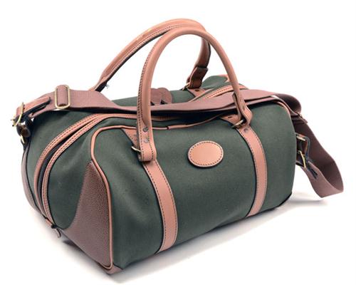 AN UNUSED GREEN CANVAS AND LEATHER HOLD-ALL BAG,