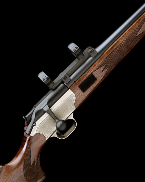 22in. nitro barrel (open sights removed) mounted at the breech end with Blaser quickly-detachable telescopic sight rail, textured action, pistolgrip stock with sculpted cheekpiece and hogsback comb, sling swivels, pistolgrip-cap, 14 5/8in. pull