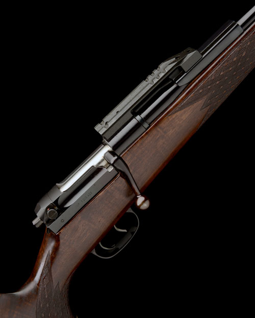 23 3/4in. nitro barrel with ramp-mounted blade fore-sight, the receiver mounted with a 'scope rail, blued finish, set triggers, pistolgrip stock with sculpted cheekpiece, monte carlo comb, pistolgrip-cap, sling swivels, 14 1/2in. pull including buttplate