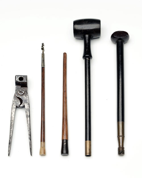 mostly circa 1840 and earlier and including two horn-tipped ramrods (one with worm end), a mushroom-pommelled cleaning rod with flat sides, an iron scissors ball-mould with sprue-cutter and a later loading mallet with ramrod handle signed 'K. STEGGLES'