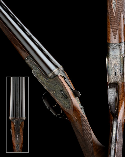 28in. nitro chopperlump barrels, the rib finely engraved with stylised floral motifs at the breech end and engraved in script ' THE ROYAL', the tubes engraved 'HOLLAND & HOLLAND. 33, BRUTON STREET, LONDON.', 2 3/4in. chambers, bored approx. 1/4 and 1/2 choke, automatic safety with gold-inlaid 'SAFE' detail, gold-inlaid cocking-indicators, rolled-edge triggerguard, the action, lockplates and furniture finely engraved with Holland & Holland ribbon scroll engraving, the makers name in scrolling banners on the lockplates, the underside with an elaborate cartouche engraved 'THE ROYAL', retaining virtually full original colour-hardening and finish, 15 1/4in. well-figured stock, weight 5lb. 13oz., in its lightweight leather case with accessories and canvas and leather outer