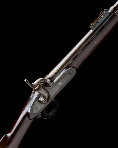 probably private purchase and dated for 1859, with 31 1/2in. barrel (externally corroded), block and blade fore-sight, elevating ladder rear-sight, Birmingham proofs, borderline engraved lock with engraved date and Queen's crown to tail (traces of colour), walnut three-quarter stock with iron furniture, original iron ramrod and bayonet lug mounted to the muzzle