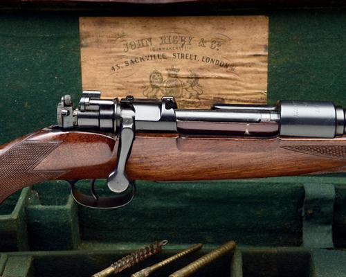 21 1/4in. nitro barrel engraved in gothic script 'JOHN RIGBY & CO. 43, SACKVILLE STREET. LONDON.', folding leaf sights for 100 and 300 yards, block mounted bead fore-sight, receiver ring engraved 'RIGBY .275 HIGH VELOCITY', side-wall (with thumb cutout) with three plugs, bolt mounted with adjustable peep-sight, flattened bolt handle, floorplate with military-style release, pistolgrip stock with horn pistolgrip-cap, sling eyes, 15in. pull including 1in. rubber recoil pad, in its full length brass-cornered canvas and leather case