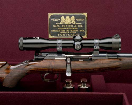 24in. unsighted nitro barrel engraved 'DANL. FRASER & CO. THE BLACK ISLE. CROMARTY.', the receiver mounted with a Zeiss Diatal-ZA 4x32T* telescopic sight in celtic engraved mounts, detachable box magazine, the receiver, butterknife bolt handle, magazine, triggerguard and screw heads finely chased with celtic designs, blued finish, the triggerguard gold-inlaid with the serial number, highly-figured pistolgrip stock with horn finial and pistolgrip-cap, cheekpiece, minor grain separation to fore-end, 14 5/8in. pull including buttplate, in its full length canvas and leather case