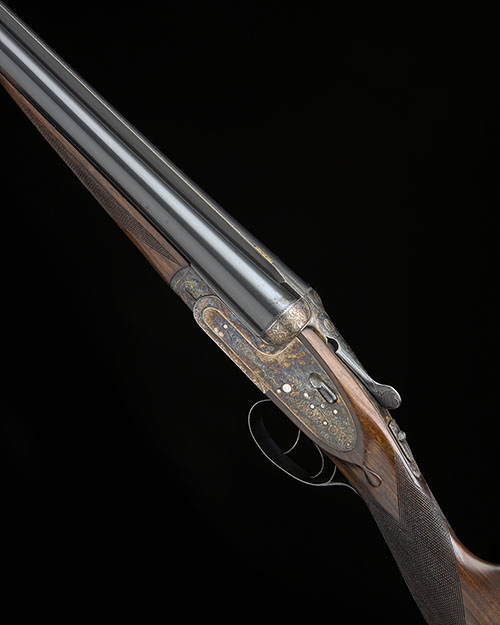 25in. nitro barrels with Churchill-rib, 2 3/4in. chambers, bored approx. true cyl. and 1/4 choke, removable striker discs, automatic safety with gold-inlaid 'S' detail, hand-detachable sidelocks, gold-inlaid cocking-indicators, rolled-edge triggerguard, articulated front trigger, floral scroll engraving, retaining virtually full original colour-hardening and finish, 15 1/2in. stock including 1in. extension, weight 6lb. 11oz.