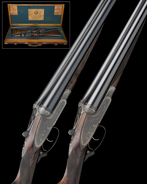 30in. nitro reproved barrels, slightly sunken ribs engraved 'HOLLAND & HOLLAND. 98. NEW BOND STREET. LONDON.' and gold-inlaid '1' and '2' surrounded by flashes of acanthus scrollwork at the breech ends, 2 1/2in. chambers, bored approx. true cyl. and 1/4 choke (both), scallop shell engraved fences, the toplevers gold-inlaid '1' and '2', manual safeties with gold-inlaid 'SAFE' details, gold-inlaid cocking-indicators, fine beaded border and bold acanthus scroll engraving, 'HOLLAND & HOLLAND' engraved and contained within elaborate cartouches, the undersides with 'ROYAL HAMMERLESS EJECTOR' engraved in similar cartouches, retaining much colour-hardening and finish, 14 1/2in. figured (probable) replacement stocks including buttplates, weight 6lb. 8oz. (both), in their makers brass-cornered oak and leather double guncase with a spare fore-end wood
