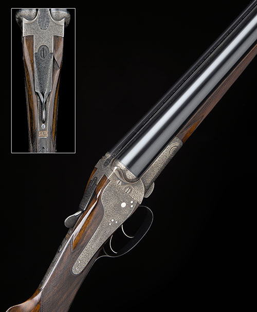 30in. nitro reproved barrels, the rib engraved 'FREDERIC. T. BAKER. 88. FLEET ST. & 21. COCKSPUR ST. PALL MALL LONDON. - SIR JOSEPH WHITWORTH'S FLUID PRESSED STEEL.', 2 1/2in. chambers, bored approx. true cyl. and 1/4 choke, hammerless action with Needham patent ejectors, patent no.1204 of 1874, Westley Richards 1871 patent top extension, carved serpentine fences, automatic safety with gold 'SAFE' detail, gold-inlaid cocking-indicators, leg of mutton back-action lockplates, border and fine acanthus scroll engraving, the underside with the F.T. Baker trademark, retaining very slight traces of original colour-hardening and finish, 15in. figured stock including 1in. leather-covered recoil pad, 6lb. 10oz., in a leather leg of mutton guncase