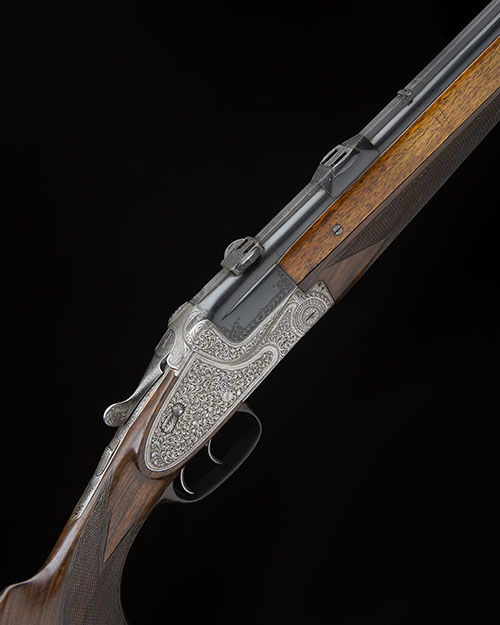 side-bolstered action, hand-detachable lockplates, cocking-indicators, articulated set front trigger, horn triggerguard, fully-engraved with bold germanic scrollwork, old silver finish, 15 1/4in. figured pistolgrip stock with sculpted cheekpiece, sling swivels, horn pistolgrip-cap, including 7/8in. rubber recoil pad, weight 6lb. 12oz. (shot barrels) and 8lb. 10oz. (combination), in a brass-cornered leather case fitted for both sets of barrels and telescopic sight