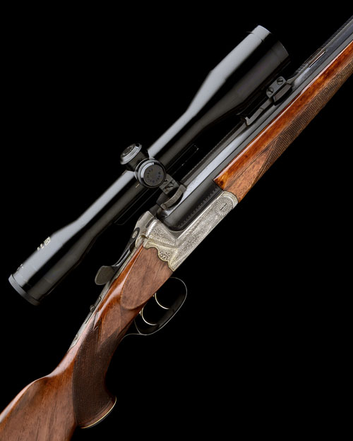 26in. nitro octagonal to round barrel with stepped solid matt top-rib, open sights removed with dovetail insert, ramp-mounted bead fore-sight, the breech end mounted with a Carl Zeiss Diatal-D 6x42 telescopic sight in quickly-detachable mounts, quadruple-grip scroll-back action with side-bolsters, removable striker disc, automatic safety, set triggers, germanic scroll engraving, the triggerguard relief engraved with the monogram 'WW', 14 1/2in. figured pistolgrip stock with sculpted cheekpiece, pistolgrip-cap, sling swivels, including 1 1/4in. ventilated rubber recoil pad, weight 7lb. 10oz.