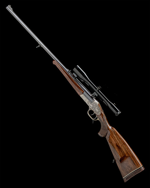 25 3/4in. nitro barrel with solid matt top-rib, open sights and ramp-mounted bead fore-sight, the breech end mounted with a Zeiss Diatal-Z 6x42 telescopic sight in quickly-detachable mounts, action incorporating Franz Jaeger 1906 patent 'kippblockverschluss' sprung breechblock, manual safety, set triggers, fully engraved with germanic scrollwork, the sideplates carved with woodland scenes of red deer and chamois, old silver finish, 14 1/2in. pistolgrip stock with slight hogsback comb, sculpted cheekpiece, sling swivels, monogrammed pistolgrip-cap, fishscale chequering and including 1in. rubber recoil pad, weight 7lb. 13oz.