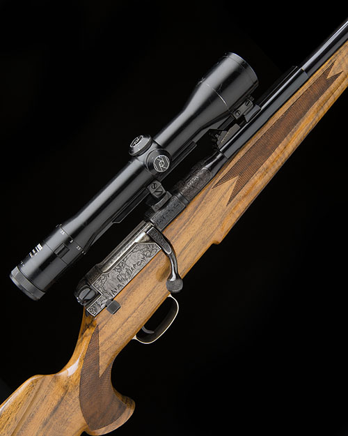 25 3/4in. nitro barrel with adjustable open sights and ramp-mounted bead fore-sight, the receiver mounted with a Zeiss Diavari-Z 1,5...6x42 telescopic sight in quickly-detachable mounts, profusely engraved with bold germanic scrollwork with gold highlights and with finely engraved game scenes of rhino and buffalo, the bolt carved and gold-inlaid with a leopard, the triggerguard with a panther, figured pistolgrip stock with hogsback comb, sculpted cheekpiece, sculpted fore-end, sling swivels, pistolgrip with engraved medallion, gold-inlaid with a monogram, 14 1/2in. pull including 7/8in. ventilated rubber recoil pad
