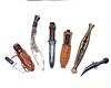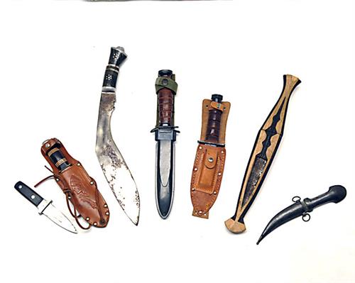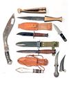 ** A COLLECTION OF SEVEN ASSORTED WORLD SHEATH KNIVES, various ages, the first a tourist market Kukri, the second a Nubian arm dagger, the third a leather handled throwing knife, the fourth and fifth copies of US military knives, the sixth a small jambiya and the last a boot knife, all with scabbards except the first and last (7)