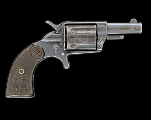 for 1884, with tapering round blued 2 1/4in. barrel, the top signed in two lines by the maker, the left hand side etched 'NEW HOUSE .38' (faint), blued fluted cylinder, blued frame, blued hammer with polished sides, chequered hard-rubber grips embossed 'COLT' and featuring the figures of a Police Officer apprehending a 'villain', sheathed trigger, the whole retaining much original finish