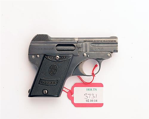 * A 6.35mm (.25 ACP) SEMI-AUTOMATIC POCKET-PISTOL SIGNED STEYR, MODEL 'PIEPER'S PATENT', serial no. 58035A, circa 1909, with tip-down 2in. barrel, sighted slide, blued frame and chequered hard-rubber grips, missing magazine, much original finish