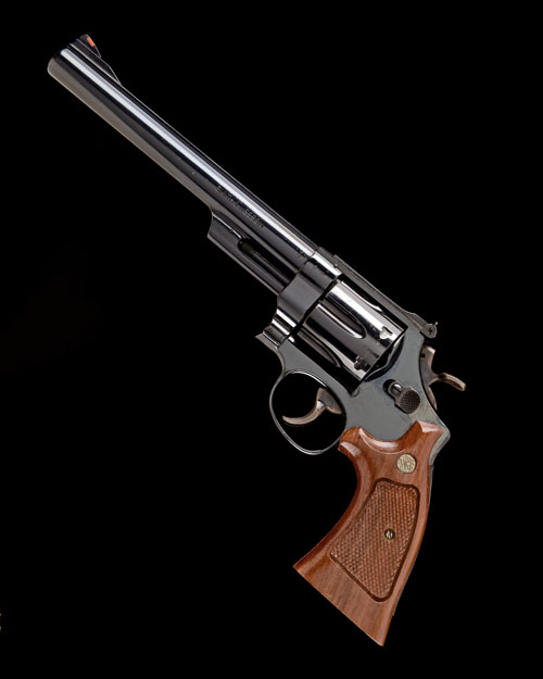 for 1980, re-numbered because of bad striking of the manufacturers serial number, with blued 8 3/8in. barrel, red ramp fore-sight blade, white outline adjustable rear-sight, blued solid frame with blued fluted swing-out cylinder with recessed chambers, colour-hardened target trigger and hammer, chequered wood Smith & Wesson grips; COMPLETE WITH its unsigned but S&W produced cedar wood case lined in blue flock