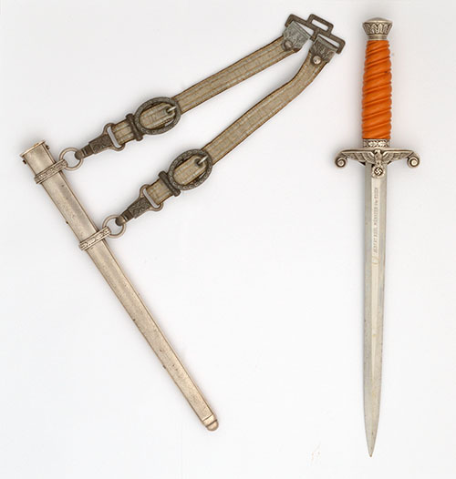 circa 1938, with 9 3/4in. stiletto blade, one side marked 'ALBERT KUHL MUNSTER 1/W-ESSEN', silver-plated eagle and swastika cross-guard with scrolled quillions, amber-coloured plastic grip to hilt and cast, plated pommel (light wear to plated parts) TOGETHER WITH its original plated scabbard (some discolouration and loss to finish) and original bullion and velvet 'DRGM' marked belt hanger (1510)
