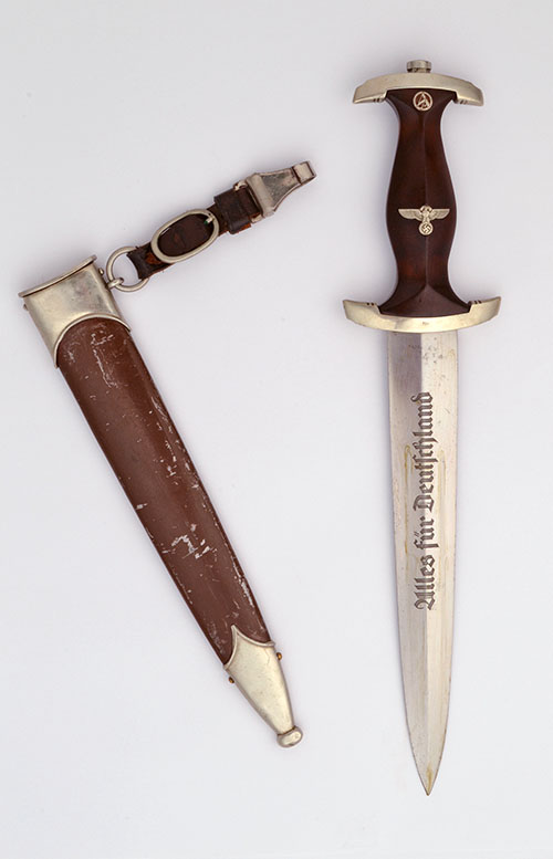 dated for 1938, with double edged 8 3/4in. blade etched with the motto 'ALLES FUR DEUTSCHLAND' (everything for Germany), makers and RZM mark to the reverse, brown wooden grip inlaid with an eagle and swastika and the 'SA' roundel to top of hilt, solid nickel fittings with area stamp 'No' (Nordsee) TOGETHER WITH its original brown anodised metal scabbard with nickel chape and throat, complete with leather hanger (good order with some scratching to scabbard anodising)(1515)