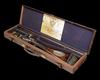 31in. black powder only bold damascus barrels, rib engraved 'HOLLAND & HOLLAND. 98. NEW BOND STREET. LONDON.', 2 1/2in. chambers, bored approx. true cyl. and 1/2 choke, bore dimensions marginal and left wall thickness below recommended minimum, E.C. Hodges patent action, patent no. 251 of 31st January 1871, use number 988, carved percussion fences, rebounding back-action locks with dolphin hammers, finely engraved with acanthus scrollwork and floral bouquets, retaining traces of original colour-hardening and finish, 14 3/8in. highly figured stock (cracked and with insert repairs at hand), the left side with large oval white metal presentation plaque inscribed with the Netherlands governmental coat of arms and 'HET NEDERLANDSCHE GOUVERNEMENT AAN W. MONTGOMERY TER HERINNERING AAN ZYNE HULPVAARDIGHEID JEGENS DE SCHIPBREUKELINGEN VAN HET NEDERLANDSCHE MAILSCHIP "PRINS FREDERIK" TE FALMOUTH. JUNI EN JULI. 1890.' (presented to W. Montgomery to commemorate his helpfulness during the shipwreck of the Dutch mailship "Prins Frederik" in 1890), weight 7lb. 4oz., in its lightweight leather case