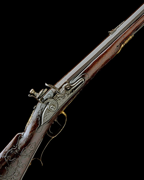 German, circa 1750, with octagonal swamped 27in. barrel, concentric circles engraved to the muzzle-flat, brass dove-tailed fore-sight bead situated within a field of rococo shells, dove-tailed standing notch rear-sight with additional folding leaf and carved and pierced tail, further rococo scroll and shells engraved to the squared solid top-tang and extending onto the breech area, curved bevel-edged lock signed within and beneath the frizzen-spring 'PERNS DORFFER, AN ANSFACH', and deeply relief carved with a scene of a stag being brought down by hunting dogs, lozenge shaped pan, re-faced frizzen carved on the front with rococo scrolls and a central grotesque mask, relief acanthus leaf carving to the hammer (top-jaw and screw probable replacements), walnut full-stock carved with borders around the barrel, ramrod channel and furniture, the majority of the remaining surface area carved in relief with loose flowing vines, iron square socket for additional peep-sight (missing) to wrist, angular raised plain cheek-piece, sliding patchbox to right hand rear of butt mounted with a rococo relief carved radiused gilded lid, border and rococo scroll engraved gilded heel-plate with relief carved rococo top-spur, en-suite trigger-guard bow with raised gilded tang, rococo relief carved and engraved gilded sideplate, turned and carved gilded ramrod thimbles and relief carved and gilded nose-cap, replacement ramrod, some wear to the gilded finish