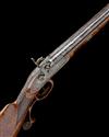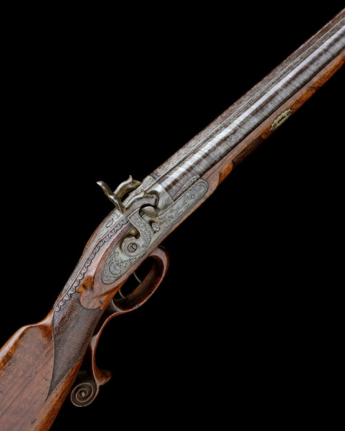 circa 1845, with equal diameter twist-iron 29in. barrels, the top-rib inlaid in silver gothic script 'RIEGER IN MUNCHEN', dove-tailed bead fore-sight, mid-mounted dove-tailed blade rear-sight, twin white-metal lines to breech and engraved rib-end, relief engraved top-tang, relief engraved bar-action locks with scenes of deer and hunting dogs, provision for swinging hammer safes (removed), scroll engraved hammers, chequered walnut 'roach-bellied' half-stock with large cheek-piece, acanthus relief carving around the top-tang and behind the cheek-piece, patch-box to right hand side of butt with carved sliding wooden lid (replaced), iron heel-plate, wooden trigger-guard bow with raised scroll-carved tang, set-trigger for the rifle barrel, the barrel key with white-metal star-burst escutcheons, iron thimbles and brass-tipped wood ramrod