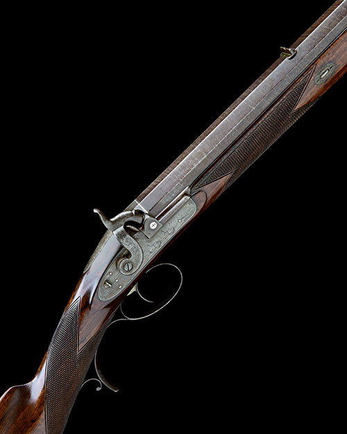circa 1850, with re-browned twist iron octagonal multi-grooved 29 1/2in. barrel, the top-flat signed 'J. PURDEY, 314 1/2 OXFORD STREET, LONDON', dove-tailed bead fore-sight, standing notch rear-sight, plain angular breech with platinum lines and vented plug, scroll engraved top-tang, the top-flat featuring a mask of a tiger, borderline engraved bar-action lock signed 'PURDEY', the front also engraved with a scene of stags at rest, the tail with scrolls, scroll engraved hammer with sliding safe behind, chequered walnut half-stock with raised cheek-piece, iron patch-box to right hand side of butt with engraved hinge, the circular lid engraved with a seated doe and a standing stag beneath a tree, the whole scene with a rope-twist border, iron scroll-engraved heel-plate with a running boar to the top-spur, engraved trigger-guard tang with chequered pistol-grip spur, border engraved trigger-guard bow with a central scene of a bolting stag, engraved finial, moulded iron ramrod throat and horn fore-end tip, plain thimbles to the under-rib and substantial ebony mushroom-headed ramrod