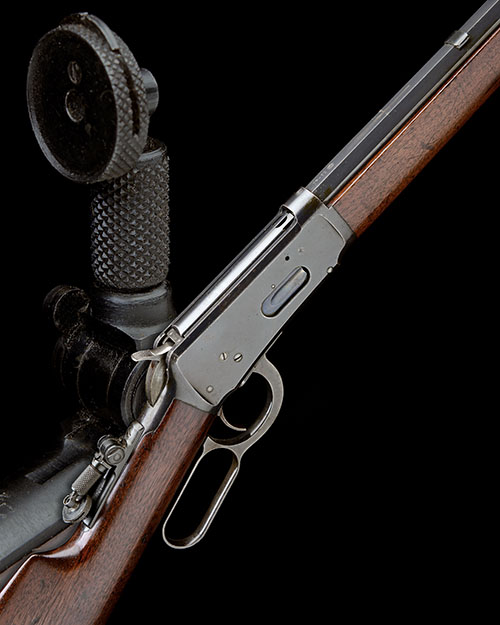 for 1904, with blued octagonal 26in. barrel signed 'MANUFACTURED BY THE WINCHESTER REPEATING ARMS CO. NEW HAVEN CONN. U.S.A. PATENTED AUGUST 21. 1884', Marbles-type tunnel fore-sight, blanking plate to the rear-sight dove-tail, plain blued receiver, blued top tang mounted with a Lyman adjustable pillar-sight fitted with a Parker-Hale adjustable aperture, walnut butt-stock, iron crescent heel-plate, blued finger-lever, walnut fore-end with iron cap and blued full-length magazine under the barrel, the whole retaining much original finish throughout,