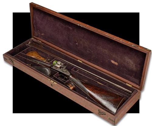 circa 1860, with blued 30in. barrels (faded), the securing loop stamped 'C.B.' possibly for 'Charles Boswell', Birmingham proofs, scroll engraved rib-end to breech-block, twin platinum plugs, engraved top-tang, border and scroll engraved locks, scroll engraved dolphin-headed hammers, walnut chequered half-stock, iron furniture and original brass mounted mahogany ramrod, the whole retaining strong traces of period finish; COMPLETE WITH a period mahogany storage case compartmented and lined in dark purple velvet and containing a square 'J PURDEY & SONS, LONDON' nickel oil bottle, a powder and shot flask and two cap-tins, the lid of case (split) with a moulded brass escutcheon engraved 'B. MACKENSIE' and a flush fitting rectangular handle
