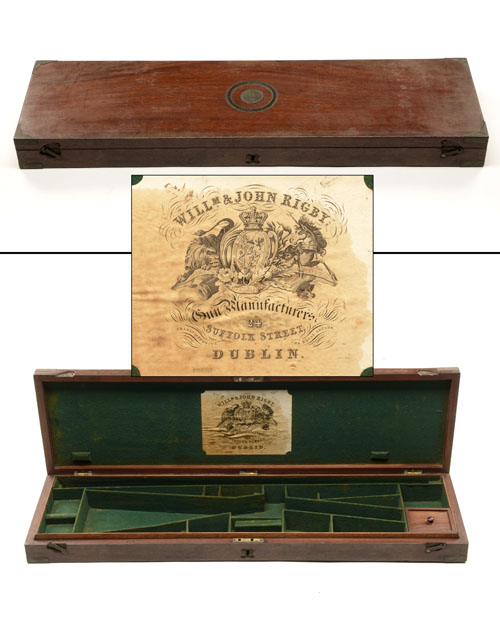 fitted for 31in. barrel, the interior lined with green baize, central brass lock (key missing), the lid interior with 'WILLM & JOHN RIGBY 24 SUFFOLK STREET, DUBLIN' trade label, the lid exterior with a brass flush-fitting carry handle