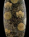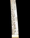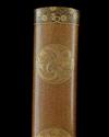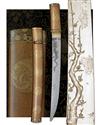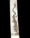 believed late Edo period and possibly for diplomatic presentation, with slightly curved 24in. spear-point blade (large patches of polished pitting), 'rolling-cloud' hamon, deeply carved 'horimono' of a warrior riding an oriental dragon to the left hand side of the blade, the reverse deeply carved with the bough of a cherry-tree in blossom, yellow metal 'habaki', laquered hilt embedded with four colour gold flecks, central large circular gold embossed panels depicting creatures from the Japanese zodiac, a rat on the left and a pig on the right hand side, blackened iron 'fuchi' and 'kashira' gilded with vines and flowers, the scabbard en-suite with the hilt but with five zodiacal panels each side depicting the rest of the animals from the Japanese zodiac, many with highlights picked out in contrasting gold colours or enamels and an en-suite 'kojiri' and 'kurikata', small losses to the laquer at the hilt-end, complete with embroidered silk storage bag