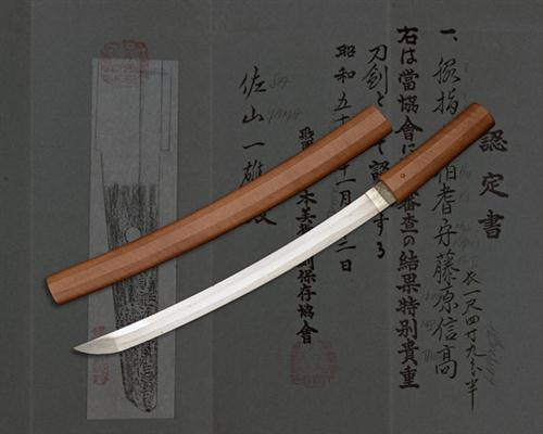A FINE WAKIZASHI BLADE IN A SHIRA-SAYA, SIGNED 'HOKI NO KAMI FUJIWARA NOBUTAKA', with certificate,