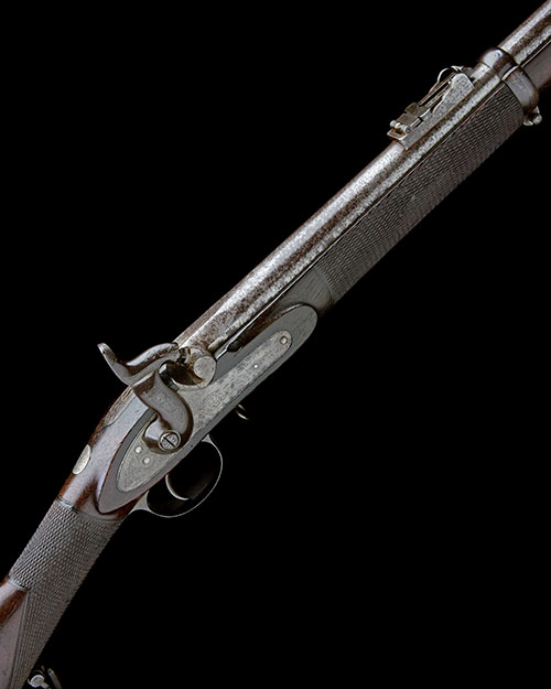 circa 1860, with round 33in. barrel (discoloured) signed 'A. HENRY EDINBURGH', block and blade fore-sight, elevating ladder rear-sight, squared angular breech-block with scroll engraving to the top-flat, borderline and scroll engraved top-tang, borderline and scroll engraved lock signed 'A. HENRY' (some shallow pitting to edges), scroll engraved hammer, chequered walnut full-stock, iron furniture including two barrel-bands and nose-cap, applied bayonet lug to muzzle and jag-ended iron ramrod.