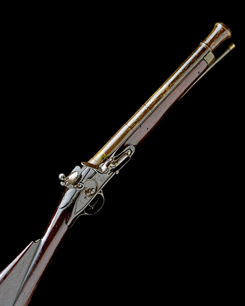 circa 1795, with heavy triple-stepped barrel, moulded band and cannon muzzle, London proofs and makers mark 'IB' with a fleur-de-lys (possibly 'James Barbar'), iron top-tang, possible replacement military-style lock stamped with 'GR' and a crown forwards of the hammer and 'TOWER' at the tail, walnut handrail full-stock, carved apron around the top-tang, heavy brass furniture including serpentine side-plate and brass reinforced wooded ramrod