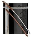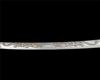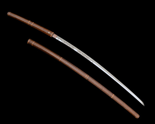 the curving 43in. blade circa 1700, visible 'hamon', the right side of the blade deeply carved with three Japanese characters, the left with deeply carved 'horimono' of two Imperial dragons facing each other, long plain tang with two mount holes, large copper 'habaki', the whole mounted in a later wood 'shira-saya', fine condition throughout