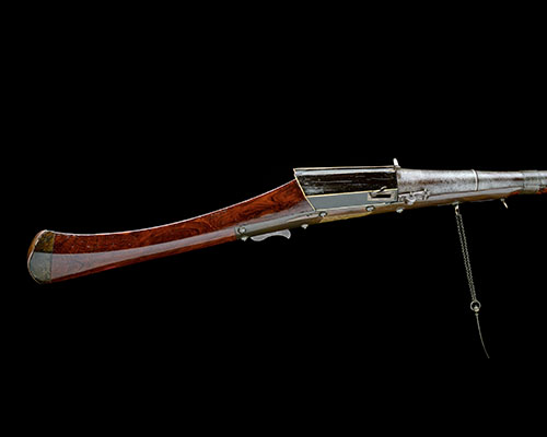 Indo-Pakistani, circa 1840, with false damascened tapering round 50in. barrel, swamped moulded muzzle with strongly flared mouth, 'corn-ear' fore-sight, conical breech with carved band and raised winged rear-sight, priming pan with manual hinged cover, concealed serpentine match-holder with carved hatchet trigger, lozenge-shaped block behind the breech covered in darkly stained horn panels banded with ivory, shaped polished teak full-stock, the 'Sind' influenced butt with horn butt-cap and copper heel-plate, coppered sideplates with engraved dome-headed rivets, chained pricker, four white-metal wire barrel-bands, iron sling-swivels and iron ramrod with faceted tip