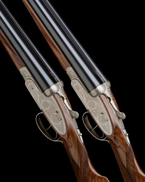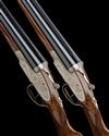 27 5/8in. (70cm) nitro chopperlump barrels, Churchill-ribs scroll engraved and gold-inlaid '1' and '2' at the breech ends, 2 3/4in. chambers, bored approx. 1/2 choke in all, actions with Holland & Holland style self-opening systems, removable striker discs, toplevers gold-inlaid '1' and '2', automatic safeties, hand-detachable lockplates, articulated front triggers, rolled-edge triggerguards, bouquet and scroll engraving, bright finish overall, 14 1/2in. well-figured stocks, weight 6lb. 11oz., in their brass-cornered leather case