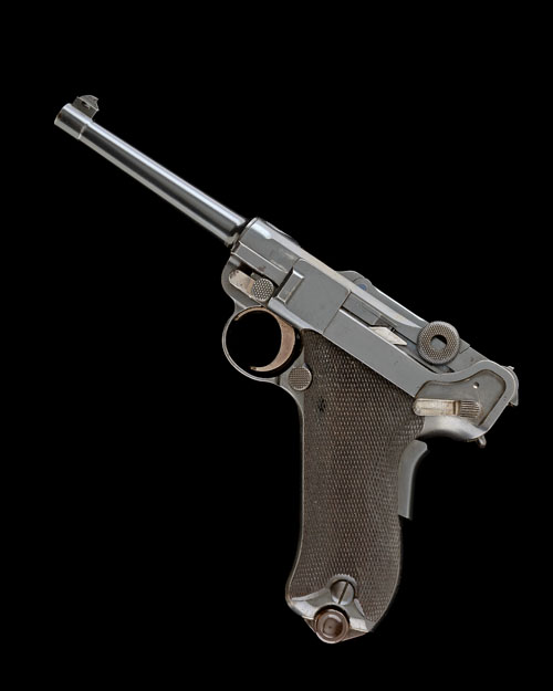 for 1913, with 4 5/8in. barrel, blued receiver with a Swiss cross within a shield engraved to the breech and a 'DWM' monogram to the toggle, blued frame, grip safety, no provision for stock-board, chequered walnut grips, two magazines with bakelite bases, virtually all original finish remaining TOGETHER WITH a leather holster of the correct type dated 1929