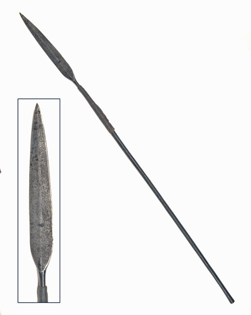 last third of the 19th century, with 13in. narrow leaf-shaped blade (some discolouration and distortion), dark hardwood shaft slightly swelling at the heel, buffalo skin binding to the socket, approximately 55 1/2in. overall
