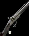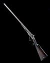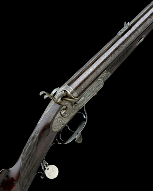 converted from muzzle-loader, serial number on buttplate only, 26in. damascus barrels with Henry patent rifling, the tubes engraved '(HENRY'S PATENT) CONVERTED TO B.L. BY G.E. LEWIS. 32 & 33 LOWER LOVEDAY ST. BIRMINGHAM.', the undersides marked 'HENRY'S PATENT A&T NO.3 / 4', matt rib with bead fore-sight and three folding leaf sights with gold-inlaid centre-lines, sprung rotary underlever, carved percussion fences, non-rebounding locks with bolted faceted hammers, engraved with acanthus scrollwork and 'SAML. & C. SMITH. PRINCES ST. LONDON', retaining some original colour-hardening and finish, spurred triggerguard retaining its reference number identification tag from the Small Arms School Corps weapons collection, 14 1/4in. figured stock with blued steel buttplate with elongated top-strap engraved with the serial number, the right side of the stock with patch box with engraved hinged trap retaining much original colour-hardening and finish, sling eyes, the stock also with an escutcheon bearing the motto 'SPES MEA CHRISTUS' surmounted with a shield crested with a lion's head erased, complete with its Small Arms School Corps collection identification tag