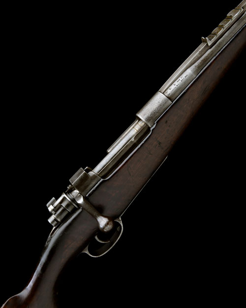 24in. nitro barrel (bluing worn) with block-mounted bead fore-sight, barrel engraved 'W.J. JEFFERY & CO. LTD. 26. BURY STREET. ST. JAMES'. LONDON. 28135', matt sighting rib with folding leaf sights engraved '1', '2', '3', '4' and '5', stippled receiver ring, Gew 98 Mauser action (with thumb cutout), hinged floorplate, figured pistolgrip stock with horn fore-end tip and pistolgrip-cap, sling eyes, 14 1/2in. pull including chequered steel buttplate (with trap), complete with its Small Arms School Corps collection identification tag
