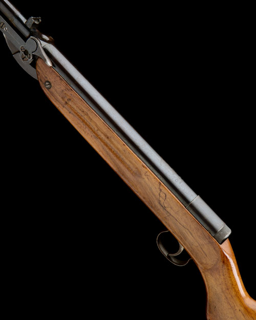 third series circa 1936, with blued tapering 19 1/2in. barrel, dove-tailed blade fore-sight, dove-tailed standing notch rear-sight elevating on a wheel, manual loading tap, blued air-chamber stamped with a standing figure of 'Diana' in the act of discarding a bow and arrow in favour of an air-rifle above the wording 'DIANA MOD. 58', milled end-cap, walnut half-stock with iron heel-plate and trigger-guard bow, two-stage trigger, finger-grooves to the fore-end sides and machined under-lever with push-button release, the whole retaining much original finish, fading to brown in high wear areas