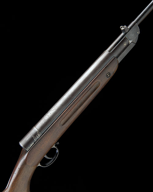 circa 1925, with blued, sighted 19in. barrel, plain blued air-chamber stamped with the Diana trade-mark above 'MOD 35, MADE IN GERMANY' (the word 'Germany' defaced), smooth trigger housing, beech half-stock with smooth semi-pistol grip (small crack at toe), iron heel-plate, finger-grooves to fore-end, the whole retaining a strong amount of original finish with light wear to air-chamber