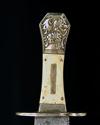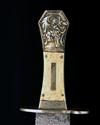 circa 1880, with substantial 12 1/4in. clip-point blade decorated along the back edge for the first 6 1/2in., the remainder false-edged, the left hand side of blade with traces of a large 'IXL' mark along with 'HUNTERS COMPANION' beneath a banner with an illegible word, assymetrical flat white-metal cross-guard, coffin hilt with white-metal bolsters, the pommel embossed with a seated lion to both sides, ivory grip-scales inlet with rectangular escutcheons TOGETHER WITH its tooled black leather scabbard embossed with the letters 'IXL' bracketed with eagles in flight (traces of gilding), embossed and gilded borders and complete with white metal separate chape and locket with fancy cut edges, the locket with large domed frog-button (knife blade with some patchy staining, the scabbard with losses to finish)