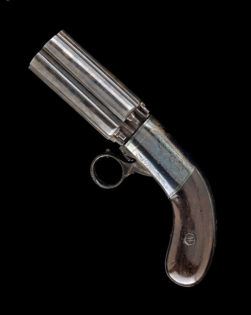 A 60-BORE PERCUSSION SIX-SHOT 'PEPPERBOX' REVOLVER, UNSIGNED, MODEL 'COOPER'S PATENT', no visible serial number,