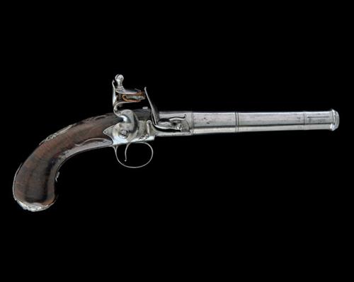 circa 1765, with triple-banded tapering turn-off 5 1/2in. cannon barrel, the top of breech signed 'W. TURVEY', the underside with London proofs, maker mark 'WT' and 'LONDON', separate florally engraved top-tang, radiused boxlock action with side-hammer and 'L' shaped frizzen-spring, smooth walnut bag-shaped butt carved around the top-tang, swollen pommel, silver hallmarked grotesque mask butt-cap (hallmarks rubbed), silver rococco escutcheon to wrist, pierced stand of arms silver sideplate, all metal surfaces cleaned and in the white
