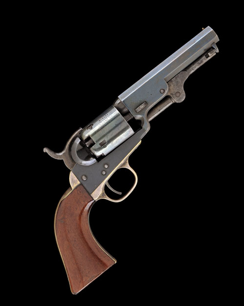 for 1856, with re-blued 4in. octagonal barrel signed in two lines near breech 'ADDRESS SAML COLT NEW YORK CITY', plain cylinder with roll-engraved 'stagecoach hold-up' scene (rubbed), blued iron frame, blued hammer and trigger, brass trigger-guard and grip-straps (traces of silver-plate remaining) and smooth walnut one-piece grip, iron surfaces refinished throughout