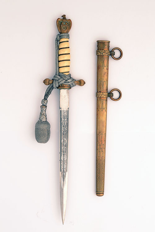 circa 1941, with double-fullered 9 3/4in. stiletto blade signed at the ricasso and etched with scrolls and fouled anchor devices, gilded bronze cross-guard with button locking catch, spiral wire-bound cream-coloured celluloid hilt with gilded bronze eagle and swastika pommel, the whole retaining good traces of original finish TOGETHER WITH its original gilded brass scabbard with lightning-bolt designs (gilding worn throughout) and a silver wire portapee knot